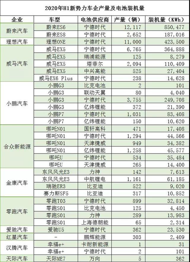 在此背景下,高工锂电梳理了2020年上半年新势力企业和车型产量情况,及相应的电池配套,具体如下: