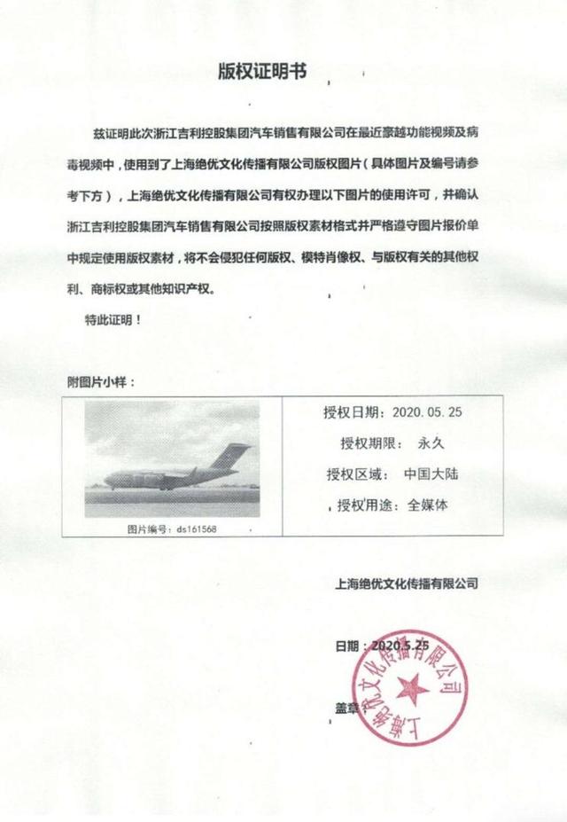 随后,吉利汽车也做出了迅速反馈,并贴出了一张版权证明书,表明在豪越功能视频等宣传材料中,使用到的是上海绝优文化传播有限公司版权图片,并未侵犯任何版权、模特肖像权、与版权有关的其他权利、商标权或其他知识产权。
