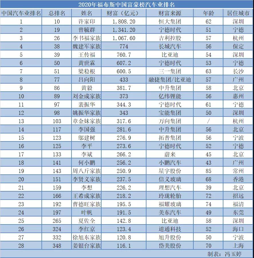 随着资本市场改革的推进,且经历全球疫情后,中国经济在各大经济体中复苏得最好。就中国汽车行业而言,除了跨界造车的许家印和姚振华,李书福、魏建军、王传福等传统车企大佬仍稳居榜单靠前位置,并且个人财富值均有所增长。得益于电动车市的火热,全球动力电池领头羊--宁德时代的创始人和董事长曾毓群的排名已然超过李书福,财富值较2018年暴涨70多倍。此外,李斌、何小鹏、李想等造车新势力代表也纷纷上榜。