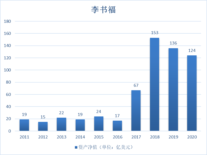 福布斯统计显示,李斌在2018年3月的资产净值为15亿美元,2019年3月为13亿美元。
