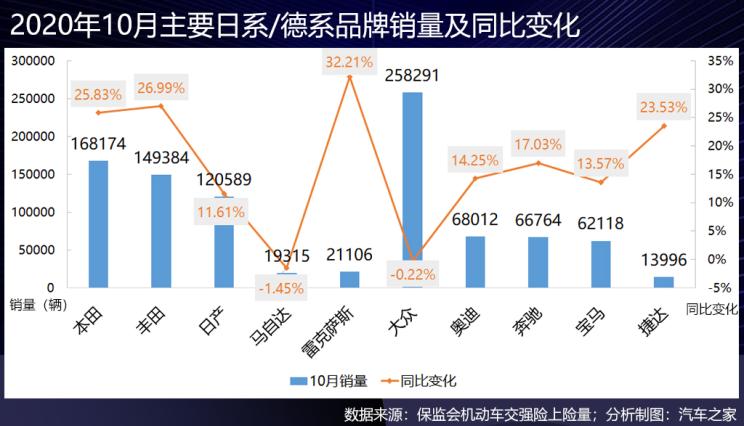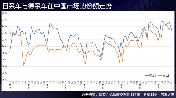 这是时隔8年之后,日系对德系的第一次“翻身”——2012年下半年开始,日系在中国市场的月度上险销量被德系反超,这种状态一直持续到2020年9月,10月份,日系8年来第一次反超了德系。