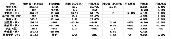 整体来看,由于正处全球汽车产业下行阶段以及受到疫情影响,十家企业2020年各项关键财务指标,如销售额、利润、现金流等全线同比下降,其中全年利润降幅最为严重,最高达到400%以上。从国别方面来看,三家亚洲企业的整体销售额要高于欧美企业,去年全年销售收入均达300亿美元。