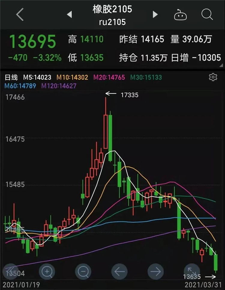 从年后,橡胶价格一路暴涨,最高点达17335元每吨,然而,随后橡胶价格开始跌价,3月31日,橡胶价格再度暴跌。从最高点开始,橡胶价格跌幅达21%,跌破14000元每吨,距离去年12000元已经很近。