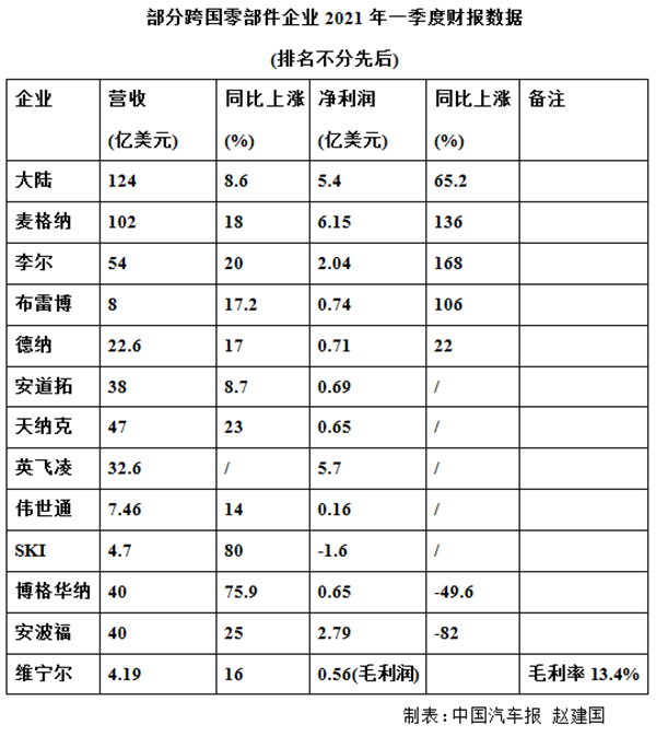 “今年第一季度,尽管遭遇芯片短缺、原材料涨价、以及疫情阴霾尚未消散等不利影响,但跨国零部件企业还是交出了一份亮丽的成绩单,这其中既有市场驱动的因素,也是零部件企业主动拥抱产业变革加速转型的收获。”中国市场学会(汽车)营销专家委员会秘书长薛旭向《中国汽车报》记者表示。
