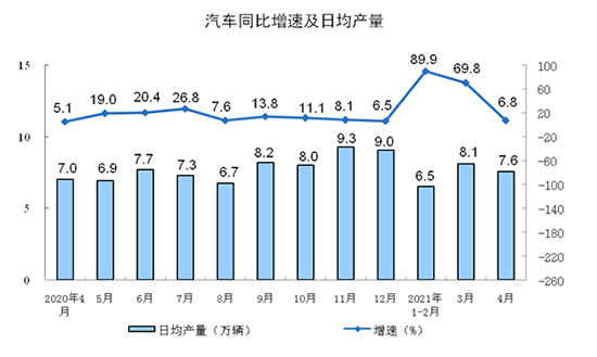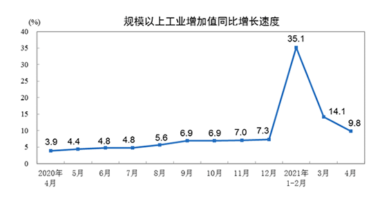 近日,国家统计局发布数据显示,4月份,规模以上工业增加值同比实际增长9.8%,比2019年同期增长14.1%,两年平均增长6.8%。从环比看,4月份,规模以上工业增加值比上月增长0.52%。1-4月,规模以上工业增加值同比增长20.3%,其中汽车制造业同比增长38.8%,增幅相对明显。