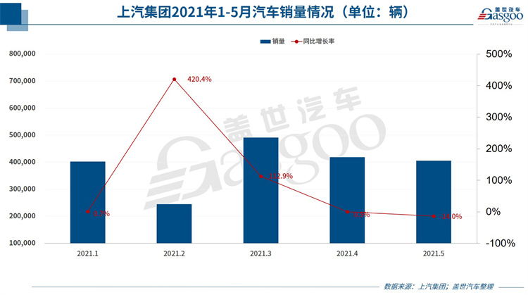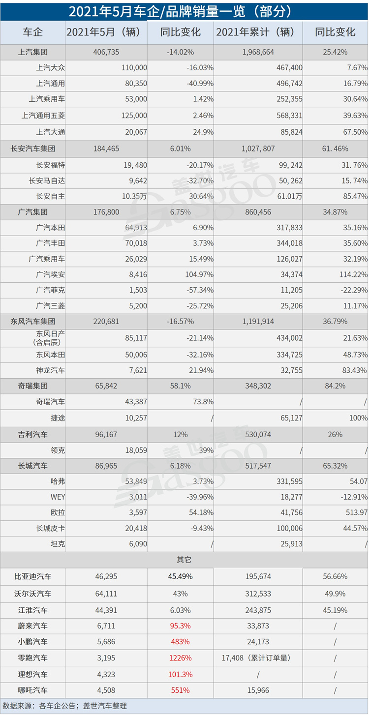 以上汽集团为例,5月其整车销量达406,735辆,同比下滑14.02%,这也使得其2021年累计销量增幅由4月的42.4%缩窄至25.4%。东吴证券分析师黄细里表示,上汽集团总体同环比表现差于行业,核心原因为芯片影响持续作用。具体来看,尽管上汽自主及上汽通用五菱同比领先行业,但缺芯导致上汽旗下合资品牌上汽大众和上汽通用销量持续疲软。