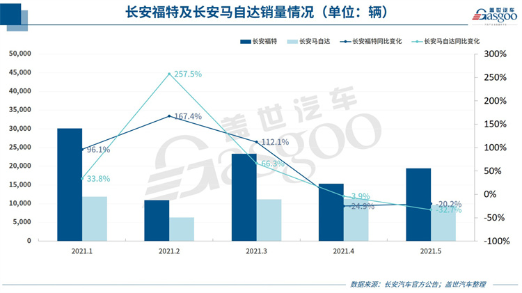 再看长安汽车,长安汽车5月销量为184,465辆,同比增长6.01%。具体来看,长安自主品牌销量继续保持高增长,5月销量10.35万辆,同比增长30.64%。虽然长安自主品牌由于受到芯片短缺等因素影响,环比呈现一定下滑,但相对来说,长安福特及长安马自达所受影响更为明显。数据显示,长安福特5月销售新车19,480辆,同比下降20.17%,长安马自达5月销售新车9,642辆,同比下降32.70%。如此成绩自然拖累了长安汽车的整体销量表现。