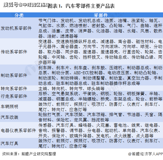 汽车一般由发动机、底盘、车身和电气设备四个基本部分组成,因此汽车零部件各类细分产品均由这四个基本部分衍生而来。按零部件的性质分类,可分为发动机系统、动力系统、传动系统、悬挂系统、制动系统、电气系统及其他(一般用品、装载工具等)等。