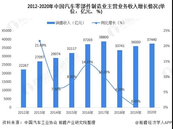 2019年,在汽车整体市场滑坡、新能源汽车补贴下降、排放标准逐渐升高等因素影响下,零部件企业面临着前所未有的压力。但我国汽车零部件制造业仍呈现稳定增长趋势。根据中国汽车工业协会对13750家规模以上汽车零部件企业统计,全年累计主营业务收入3.6万亿元,同比增长0.35%。初步估算,2020年中国汽车零部件制造业主营业务收入在3.74万亿元左右。