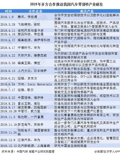 为了解决技术瓶颈,零部件企业在加强自身产品研发投入的同时,也在积极寻求与相关单位的合作。如下图所示,有的整车企业与零部件企业合作研发汽车零部件,如上汽大众和日本瑞萨共同成立汽车电子联合实验室;有的整车企业与IT企业合作开发汽车零部件,如江淮汽车与华为合作开展智能汽车解决方案、企业信息化、智慧园区、智能工厂等领域的研究;