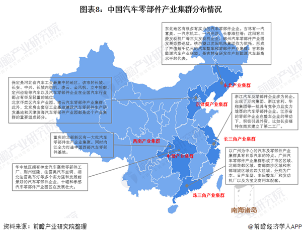 我国汽车零部件工业是伴随整车厂起步发展的,基本都是围绕整车生产基地,呈现集群式发展。经过多年发展,中国已形成东北、京津冀、中部、西南、珠三角及长三角六大汽车零部件产业集群。