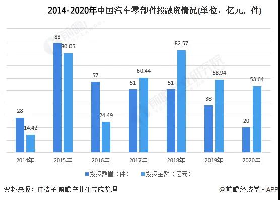 近年来,中国汽车零部件市场已经进入规模化发展阶段。2014-2020年中国汽车零部件产业投融资市场呈现波动增长态势,市场于2015年达到峰值,投资数量和投资金额分别为88件和80.05亿元。2020年,中国汽车零部件产业投资规模为53.64亿元,汽车零部件还有很大投资空间。