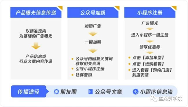 针对汽车后市场广告主不同的营销诉求,腾讯广告打造了多样化转化链路玩法,通过产品活动曝光、公众号吸粉、小程序(预约,购买)等推广链路式,帮助广告主实现高效精准获客提升转化。
