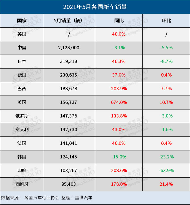 5月份,全球车市一半阳光,一半阴霾。欧美汽车市场继续回暖,销量呈稳步增长态势;其中以英国表现最为突出,销量暴增7倍。相比之下,亚洲市场复苏渐缓;受芯片短缺影响,中国汽车产销双双下降;韩国汽车产量同样因缺芯承压,同时国内需求又受到新冠感染病例激增冲击。