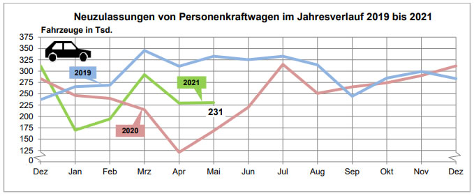 5月德国总体新车销量达230,635辆,同比提升37%,这一定程度上也是因为去年同期基数较低,2020年5月,受疫情大流行的影响,德国新车销量与2019年5月相比下降了接近一半。
