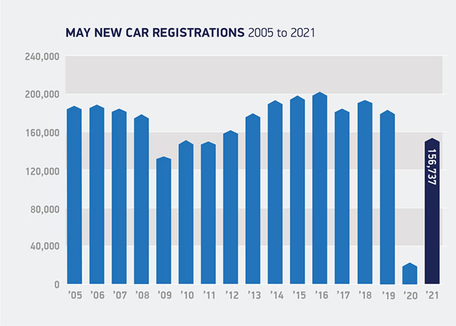 英国汽车制造商与经销商协会(SMMT)的数据显示,今年5月,英国新乘用车注册量达到了156,737辆,同比暴涨674%,这一定程度上是因为去年整个5月英国汽车经销店因疫情全部关闭;另外来自商务客户的车队需求也为整体销量做出了很大贡献。尽管同比增幅十分强劲,但是较2019年5月的数据相比,销量仍然下滑了14.7%,与10年来的5月平均销量相比也下降了13.2%。