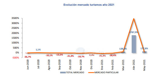 西班牙2020年6月至2021年5月汽车销量走势(图片来源:ANFAC)