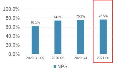 第一组数据是加盟商满意度。加盟商净推荐值(NPS)从2020第一季度的60%提升到2021年第一季度历史新高的76.5%(行业平均NPS 51.29%)。【注:NPS是一个衡量用户对品牌、产品、服务的推荐意向的指标,在全世界被包括苹果公司在内的成百上千家公司使用。连续7年来,博世车联主要利用NPS衡量加盟商的用户体验。】