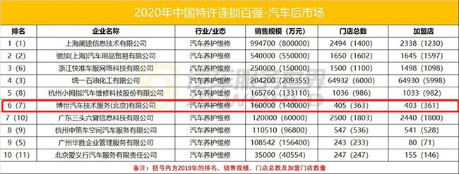 《2020中国特许连锁百强》榜单中,博世车联以16亿产值、405家门店总数位于榜单第6名,相较于去年名次有所提升。