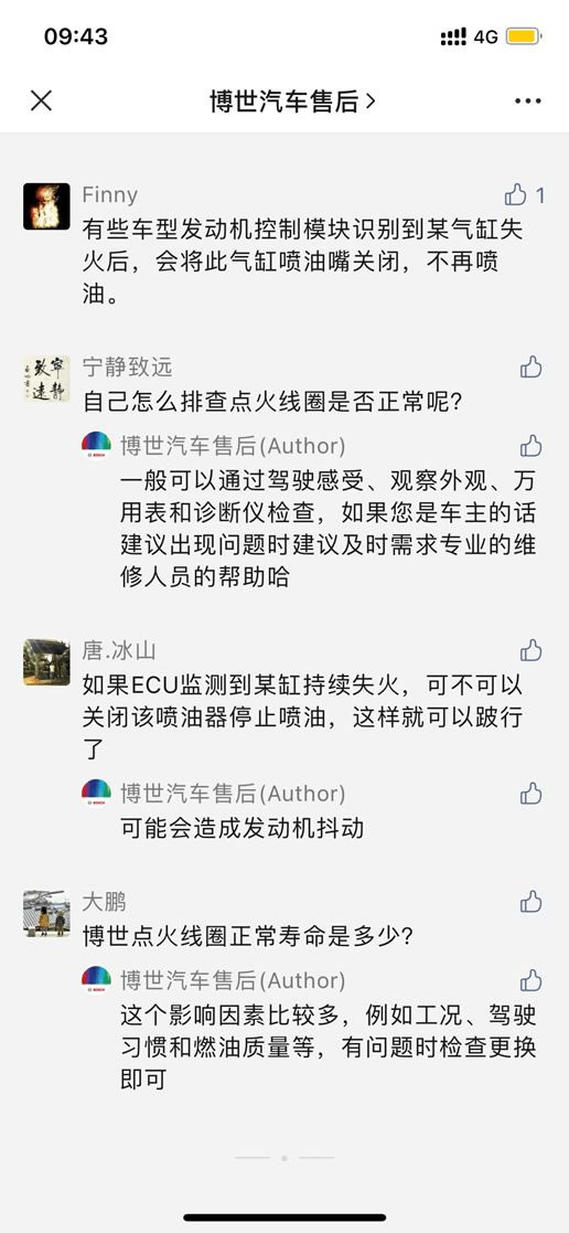 在博世汽车售后官方微信文章中,底部留言区随时可见门店有“技术或者教程视频”的相关咨询。