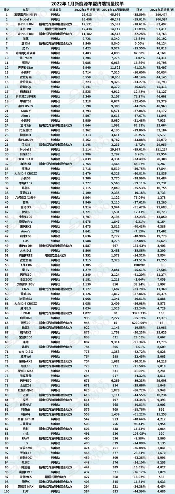 盖世汽车根据1月份国内新能源车型终端销量,整理出1月销量榜单TOP100,并涵盖车型对应2022年1月销量、2021年12月及销量环比增长情况,2021年1-12月累计车型销量
