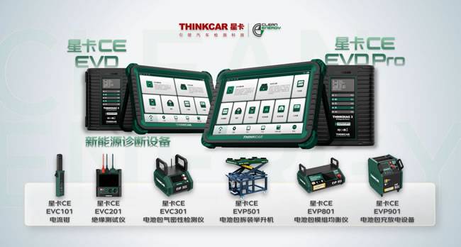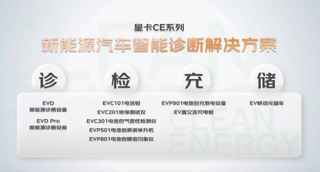目前星卡新能源诊断产品线规划为三大类:诊断类设备:推出星卡CE EVD和EVD Pro,两款智能诊断设备;检测类工具:推出星卡CE EVC101电流钳、EVC201绝缘测试仪、EVC301电池包气密性检测仪、EVP501电池包拆装举升机和EVP801电池包模组均衡仪;充储类设备:推出星卡CE EVP901电池包充放电设备、EV直交流充电桩和EV移动式充储车。