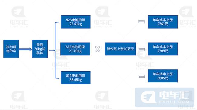 而3月7日伦镍期货的交易价格就从3万美元/吨涨到了5万美元/吨(约合人民币31.6万元/吨)。在镍价为5万美元/吨的情况下,Model3(76.8度电)单车成本上升1.05万元,小鹏P7(80.87度电)则是上涨1.1万元,蔚来EC6(70度电)上涨0.95万元,这三款车型单车成本上涨均在1万元左右。