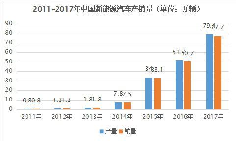 近几年来,我国新能源汽车发展迅速,在政策和市场的双重支持下,走向产业化和规模化。2011年,我国新能源汽车产销均为0.8万辆台,不足汽车产销的千分之一;到2017年,新能源汽车产销分别达到了79.4万辆和77.7万辆。从近几年的发展势态来看,我国新能源汽车产业已经进入快速增长阶段。