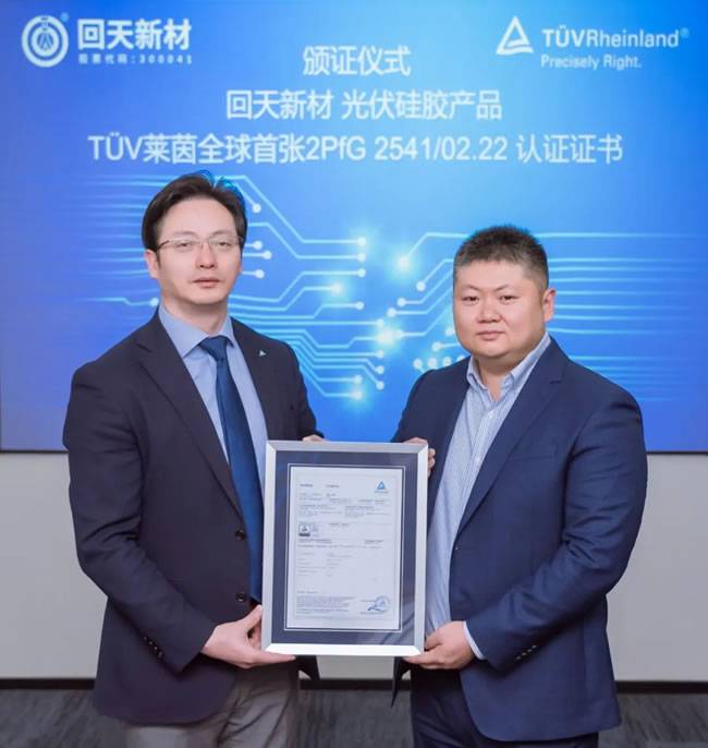 “全球首张光伏硅胶产品2PfG 2541/02.22认证证书正式颁发回天新材!”2022年10月11日,TÜV莱茵&回天新材颁证仪式在上海举行。回天新材董事长章力先生、德国莱茵TÜV集团全球电力电子产品服务副总裁李卫春先生及双方代表出席本次仪式。