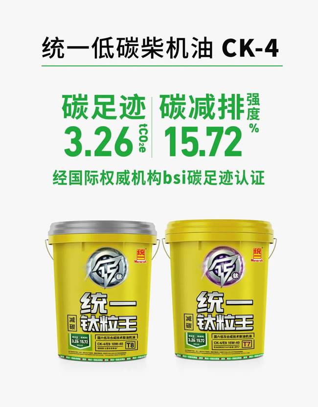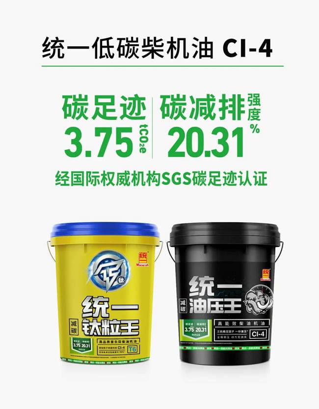 作为中国领先润滑油生产企业以及中国低碳润滑解决方案供应商,统一润滑油不仅为各大行业全产业链提供高效的全车油液润滑解决方案,还依托T-lab低碳润滑实验室,打造了一系列低碳产品。根据柴机油API不同级别(CH-4、CI-4、CJ-4、CK-4),统一润滑油分别推出了包含钛粒王、油压王、超粘王、耐劳王4个系列在内的低碳商用车润滑油产品。其润滑性能突出,可减少发动机对能源的消耗。同时,产品本身也具有高减碳值,双重低碳助力环保。