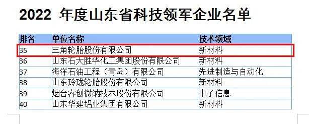11月9日,山东省科技厅、山东省科学院情报研究所、山东省创新发展研究院联合公布了2022年度山东省科技领军企业和首批科技小巨人企业名单。其中,三角轮胎从全省众多高新技术企业群体中脱颖而出,入选2022年度山东省科技领军企业。