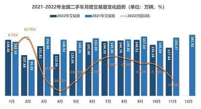 日前,根据中国汽车流通协会公布的数据,2022年11月全国二手车市场交易量为127.84万辆,环比下降5.43%,同比下降17.18%,交易金额为769.38亿元;1-11月累计交易1461.15万辆,同比下降8.5%。流通协会预计12月全国二手车交易量将在132万-134万辆之间,高于11月。