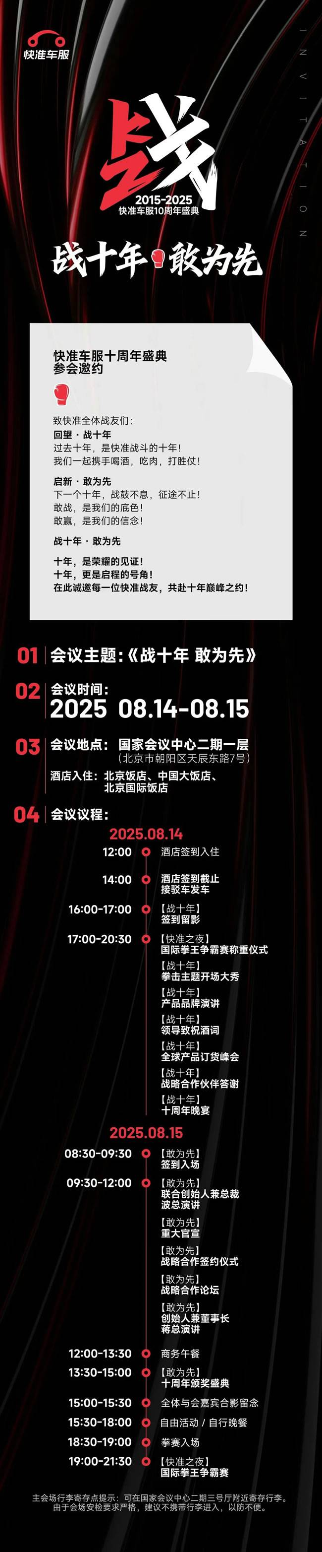 2025年8月14日至15日,北京国家会议中心将迎来快准车服十周年盛典。本次活动以"战十年 敢为先"为主题,设置荣耀晚宴、战略发布及由徐灿领衔的"快准之夜·IBO职业拳王争霸赛"三大核心板块。