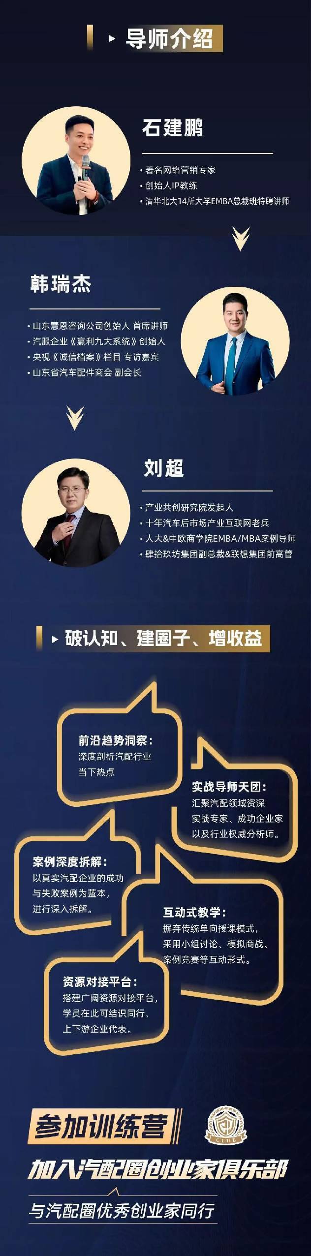 沈阳站训练营的讲师阵容堪称"黄金配置",三位讲师分别从创始人IP打造、汽配转型创新盈利增长、合伙共创增长三个维度构建知识体系,形成全方位的增长解决方案。