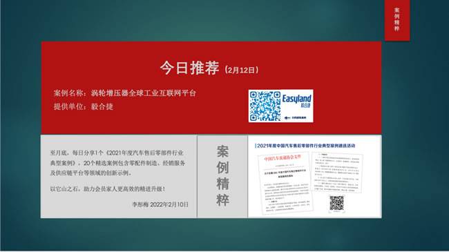 (2月12日)推荐案例来自咱们副理事长单位毅合捷,涡轮增压器全球工业互联网平台示例,可以体会到头部零部件制造企业的发展阶段、战略定位、平台化布局、社会优质资源吸收利用等,对于后市场企业升级发展应该有所借鉴。