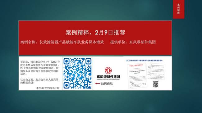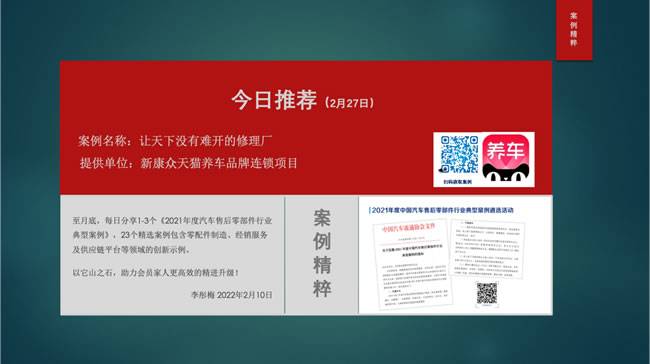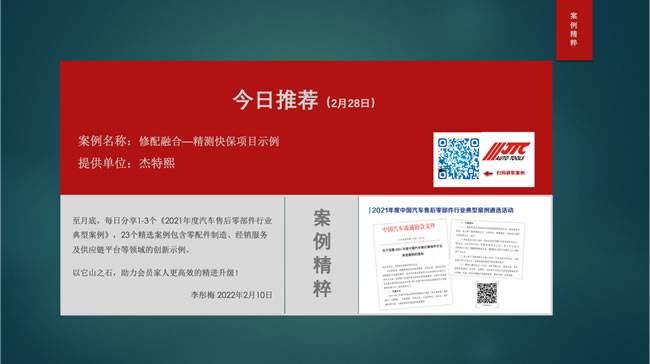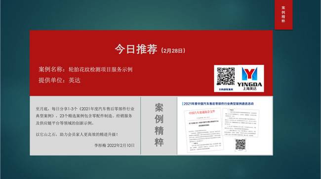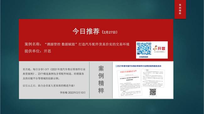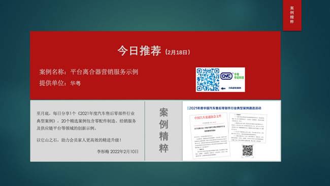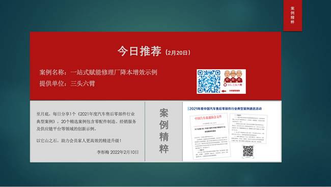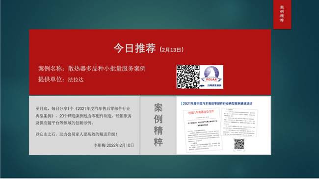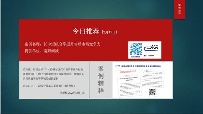 【导读】从2月9日开始至月底,每日8:00,中国汽车流通协会售后零部件分会秘书长李彤梅女士都会分享1个《2021年度汽车售后零部件行业典型案例》,案例包含零配件制造、经销服务及供应链平台等领域的创新示例。以它山之石,助力会员家人们更高效的精进升级!截止目前已经分享20个精选案例,扫描图片上的二维码即可查看。