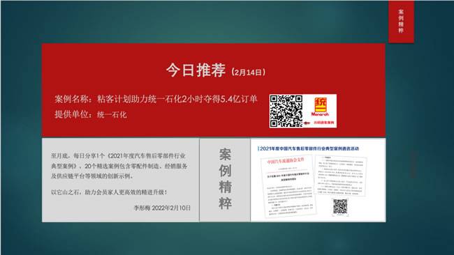(2月14日)推荐案例来自统一石化,《粘客计划助力统一石化2小时夺得5.4亿元订单 》是统一石化2020年经销商大会的战绩,2021年的战绩是7.2亿元。成功运营的主要措施及关键环节案例中有些体现,期待对大家有用。