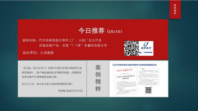 (2月17日)推荐案例来自咱们理事单位江南模塑,《汽车经销商联合零件工厂、主机厂自主开发加装改装产品,实现厂商多赢的实践》示例在2021年度中国汽车流通行业年会上分享后,得到较高关注和呼应。案例简短,但创新思维、切入点和运营能力值得借鉴,期待对大家有益。