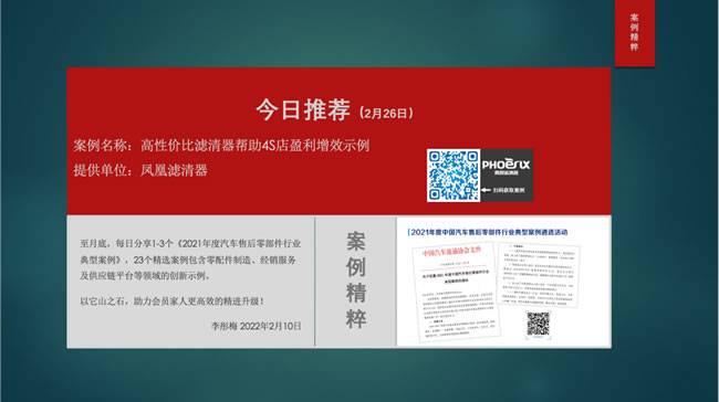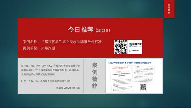 (2月26日)推荐2个案例,分别来自咱们副理事长单位邦邦汽服和凤凰滤清器 。《“邦邦优品”树立民族品牌事故件标准 》,着力解决后市场因品牌件品质等级复杂,无法判定品牌对应的价值等此类问题,案例介绍了实施方略;《高性价比滤清器帮助4S店 盈利增效》示例,得到主机厂备件部门及4S店高度认可,期待2个案例对大家创新发展有所启发。