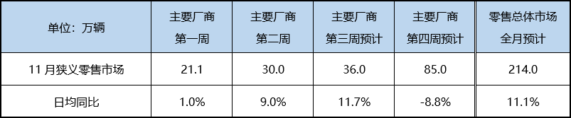 终端监测结果显示,11月初总体市场折扣率约为16.0%,相比上月略有收窄。一方面,豪华品牌在年末收价保利;另一方面,中低端产品继续加大促销力度,力保全年销量目标。据经销商调研显示,今年11月厂商零售目标同比增长10.9%,约占总体市场80%的样本量,初步推算本月狭义乘用车零售市场在214.0万辆左右,同比增长约11.1%。